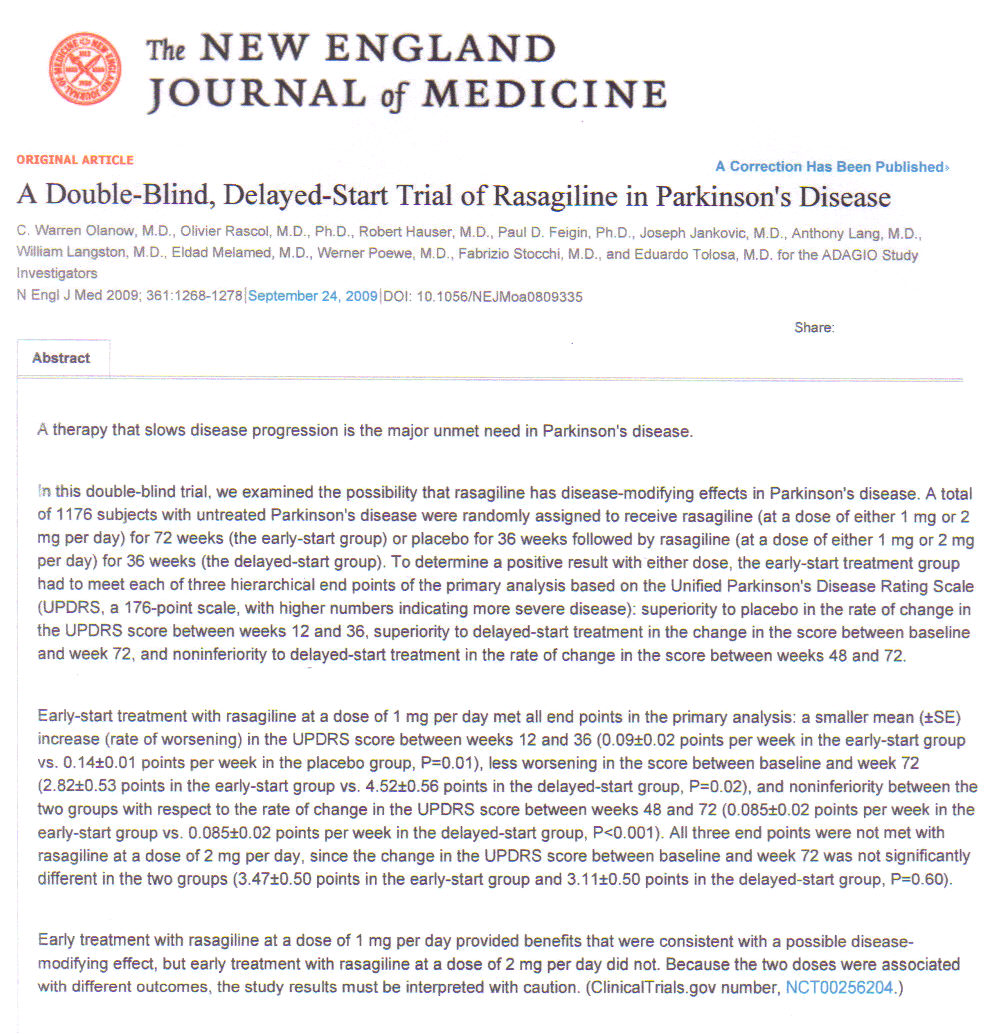 In the meantime, what do we do? There is merit in the argument that we should give every PD patient the “good” dose of rasagiline, because the study suggested neuroprotection. When the results come out from a 10 year study, it will be too late for today’s patients. But many neurologists do not do this.