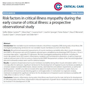 The research article reviewed here (Weber-Carstens et al., 2010) describes a study looking at a relatively new electrophyiological test for myopathy, namely measurement of muscle membrane electrical excitability to direct muscular stimulation. An attenuated response on this test will indicate a myopathic process unlike a reduced traditional compound muscle action potential that could reflect either neural or muscular pathology. Furthermore, while an EMG interference pattern is dependent on some background ongoing voluntary muscle activity, the test can be performed on a fully unconscious patient. The study uses this test to explore the value of various putative clinical or biochemical markers recorded early in the patient’s time on ITU that might subsequently predict the development of critical illness myopathy.