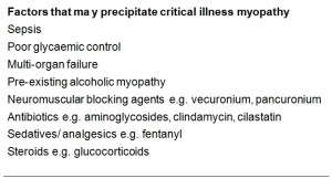By way of general observation rather than opinion on this research, and extending the argument on investigating less critically ill patients, I have wondered if critical illness myopathy might in fact occur in acutely unwell patients who do not reach ITU at all. There are many neurological and other conditions that predispose to catabolic states, such as patients with chronic infection or inflammation, those who had preexisting disuse atrophy, those on steroids, or those who were already chronically malnourished due to poor care or poor or unsafe swallowing before they deteriorated such that they required acute hospital care. Even patients without pre-existing disease, such as those who have suffered acute stroke, may subsequently be susceptible to a catabolic state due to aspiration, other infection, immobility or suboptimal nutrition. One can speculate that large numbers of patients with stroke, multiple sclerosis relapse or other acute deteriorations requiring neurorehabilitiation may have significantly impaired or delayed recovery due to unrecognized superadded critical illness neuropathy. Certainly in stroke, important measures found to improve outcome, such as early physiotherapy and mobilisation, early addressing of nutrition, treating infection and good glycaemic control, happen to be among the key elements in treating critical illness myopathy. More directed and aggressive management along these lines in a subgroup of these patients who have markers for critical illness myopathy might further accelerate improvement and achieve a better final outcome.