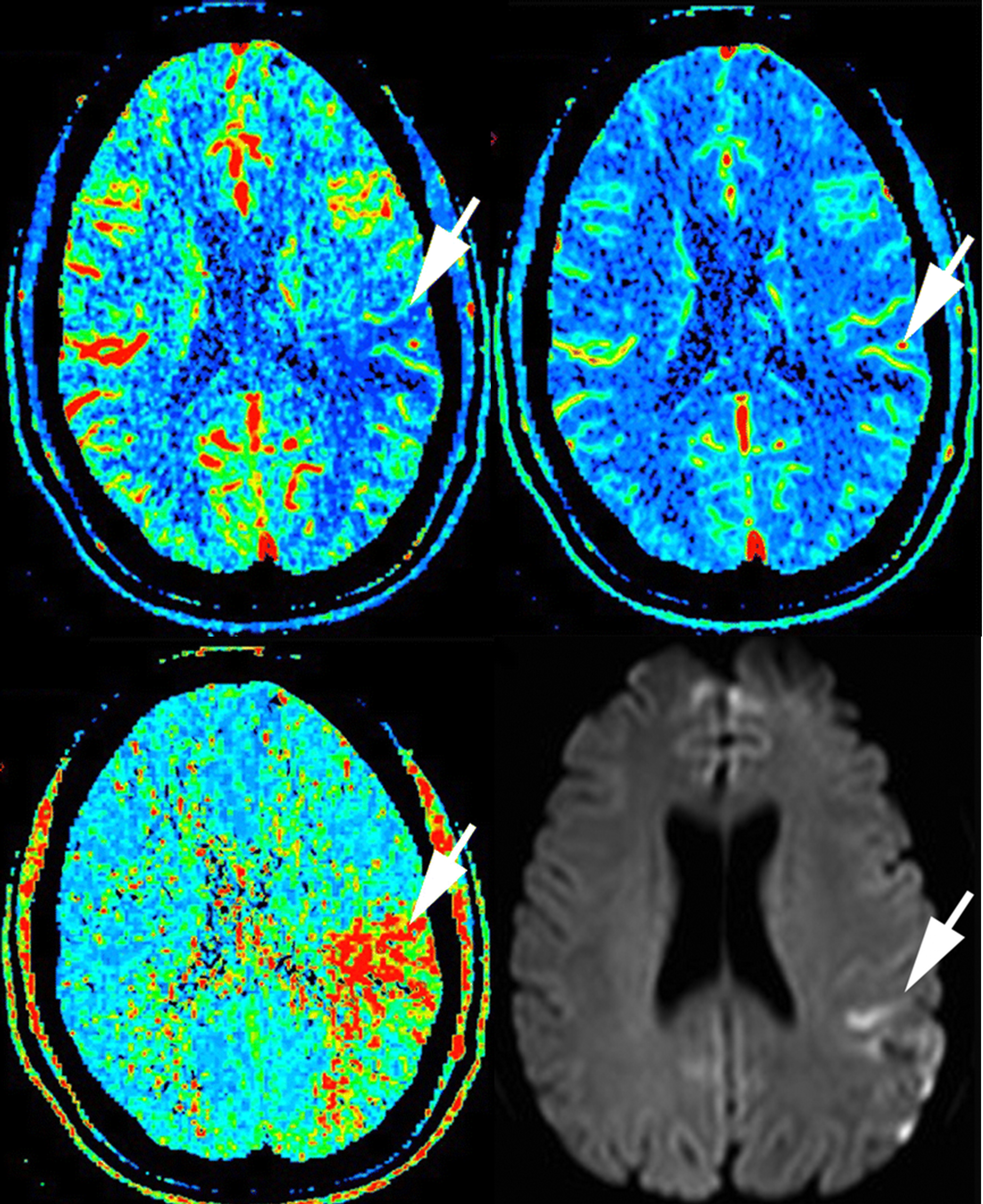 In a patient 70 minutes after stroke onset (NIHSS score 10), the unenhanced CT, not shown, is normal. The cerebral blood flow (top left) and cerebral blood volume (top right) show reductions in the arrowed area. There is a corresponding increase in mean transit time (bottom left) and a DWI weighted high signal area several days later on MRI (bottom right). (Figures taken from Hopyan et al., 2010.)