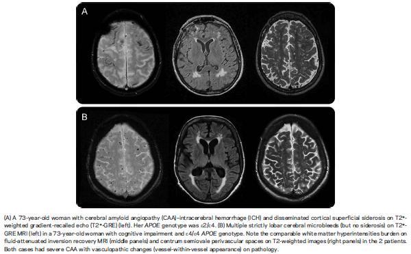 This paper, by Chridimou et al. (2015) in Neurology, looks at these associations retrospectively by a database review of brain biopsies or of evacuated haemorrhage material. These are correlated with MRI findings and APO E ε genotype in patients with positive pathological findings.